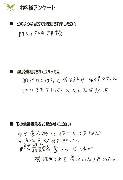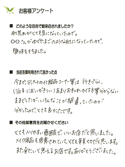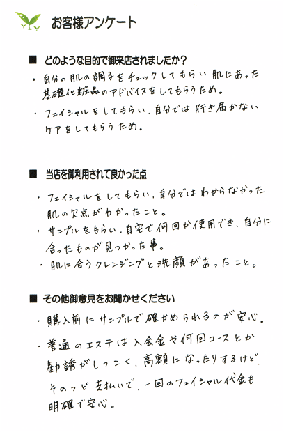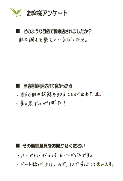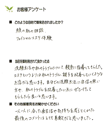 この方は、毎日のクレンジングを心掛けていらっしゃったのでもちもちしていて乾燥もなく健康肌でした。目の周りが少し乾燥することがあり、ローションパックをされていたので、そのまま継続していただくようにお話しました。あごの辺りにニキビが出来ることがあるとのこと。あごのラインのクレンジングを丁寧に行うことと夜中のお菓子は少なめにしましょうね。