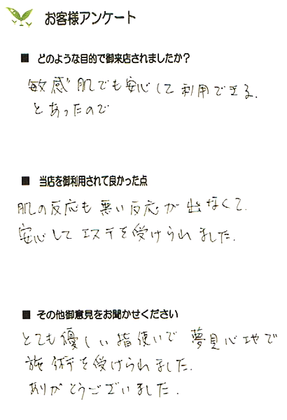 この方は、頬の皮膚が通常よりも薄く赤みがありました。フェイシャルケアでは、クレンジングの時間を8分程度に短くし、頬の部分は必要以上にマッサージをすることを避けました。施術後「いつもよりも赤みが少ない」とのご感想を頂き、お客様から安心感を得ることが出来ました。