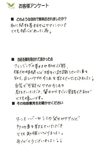 お子様がまだ小さく、普段お手入れに時間を割けないとのことだったので、子育ての合間にできる効率的なクレンジングの方法をお話しました。