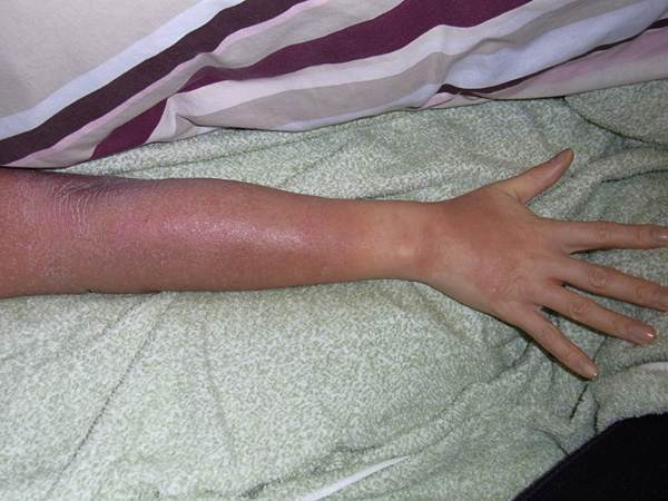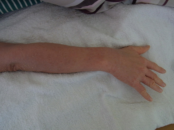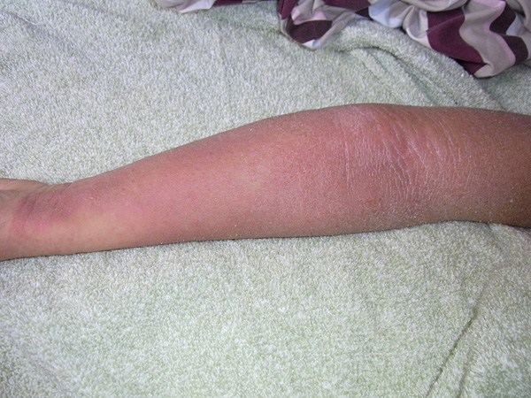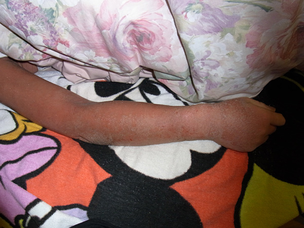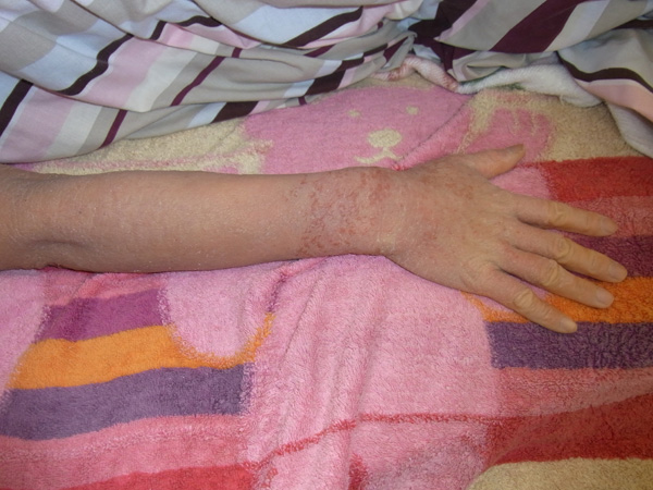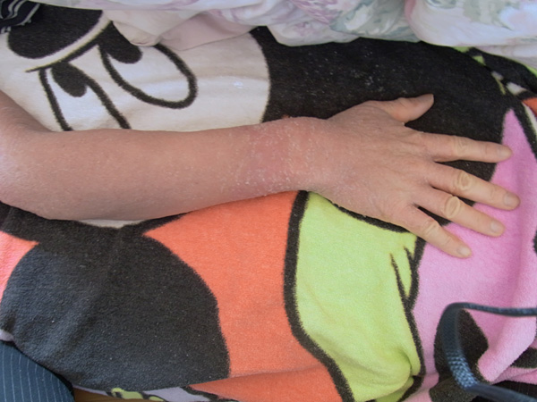2月7日に急変、症状が急激に悪化する。自覚症状は寒気、全身に皮膚の痛みと違和感がある。皮膚は全身に腫れが現れ、熱感をともなう赤みがひろがると同時に、滲出液によるジュクジュクもみられる。