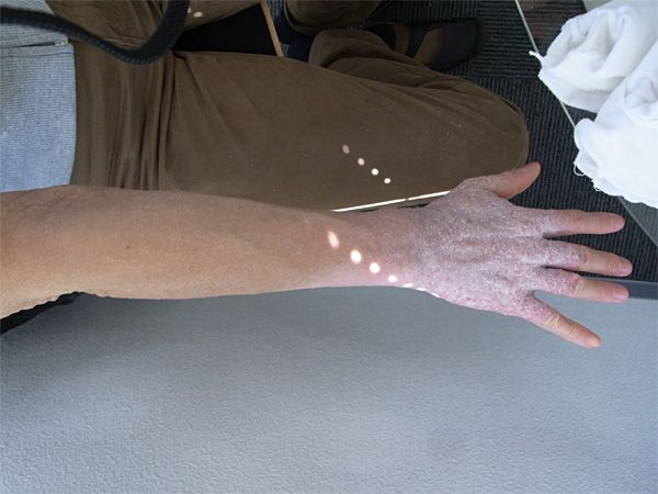 このお客様の場合は、基本的に毎日、リスブラン化粧品によるローション湿布(ノンEローションマイルド、ジネンミスト)でのスキンケアを行い、必要に応じてノンEクリームによる保護を行いました。その他、皮膚を清潔に保って頂くように、お肌の回復にプラスとなる入浴剤を使って頂きました。