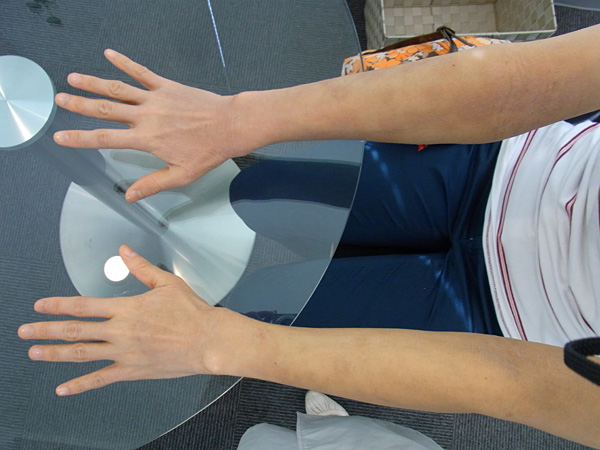 小さい頃からアトピー性皮膚炎を持っておりましたが、成人以降はそんなにひどい症状に陥ることはありませんでした。昨年の秋、仕事が急に忙しくなったせいか、急にひどいアトピーの症状が出始めました。強いステロイドの薬を塗って3日で収まりましたが、止めるとまたドッと症状がでたことに不安を感じ、ステロイドを使うのをやめました。はっきり言って、こんなひどい症状になるとは思ってもいませんでした。離脱症状が起きていることも当時は何の知識もなく、なぜひどくなる一方なのか不安な日々を過ごしていました。でも、「ステロイド」はやめたいという思いが強く、自分で勝手に薬を塗るのをやめてしまいました。でも症状は悪化するのみ。不安を抱えながらインターネットでたまたま目についた「しおみの杜」に予約を入れ、来店しました。12月の終わりのことでした。